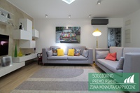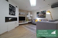 Il primo piano ospita l’appartamento principale con una superficie di 117 mq. Internamente gli ambienti sono ben distribuiti: la zona giorno (composta da soggiorno e cucina abitale) è ampia e luminosa grazie all’ affaccio sul balcone; la zona notte è organizzata in due camere da letto, una con terrazzo privato l’altra dotata di cabina armadio, e bagno con grande doccia. Nel vano dove attulmente vi è la cabina armadio, inoltre, sono stati predisposti gli allacci per la realizzazione di un secondo bagno. Questo piano è riscaldato da impianto a pavimento con caldaia a condensazione, integrato da un termocamino a gas che contribuisce al comfort e all’efficienza energetica.